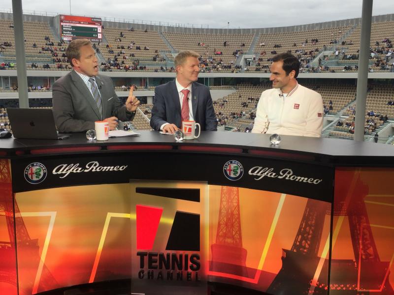 Roger Federer joins Brett & Jim Courier on the Tennis Channel set at Roland Garros.